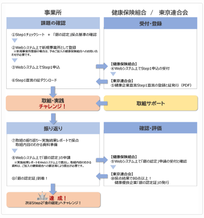 健康企業宣言東京推進協議会が定めた「評価基準と確認方法」に基づき審査を行い、80点以上の点数を満たした企業に、健康保険組合連合会東京連合会が発行する「健康優良企業 銀の認定証」が交付されます。